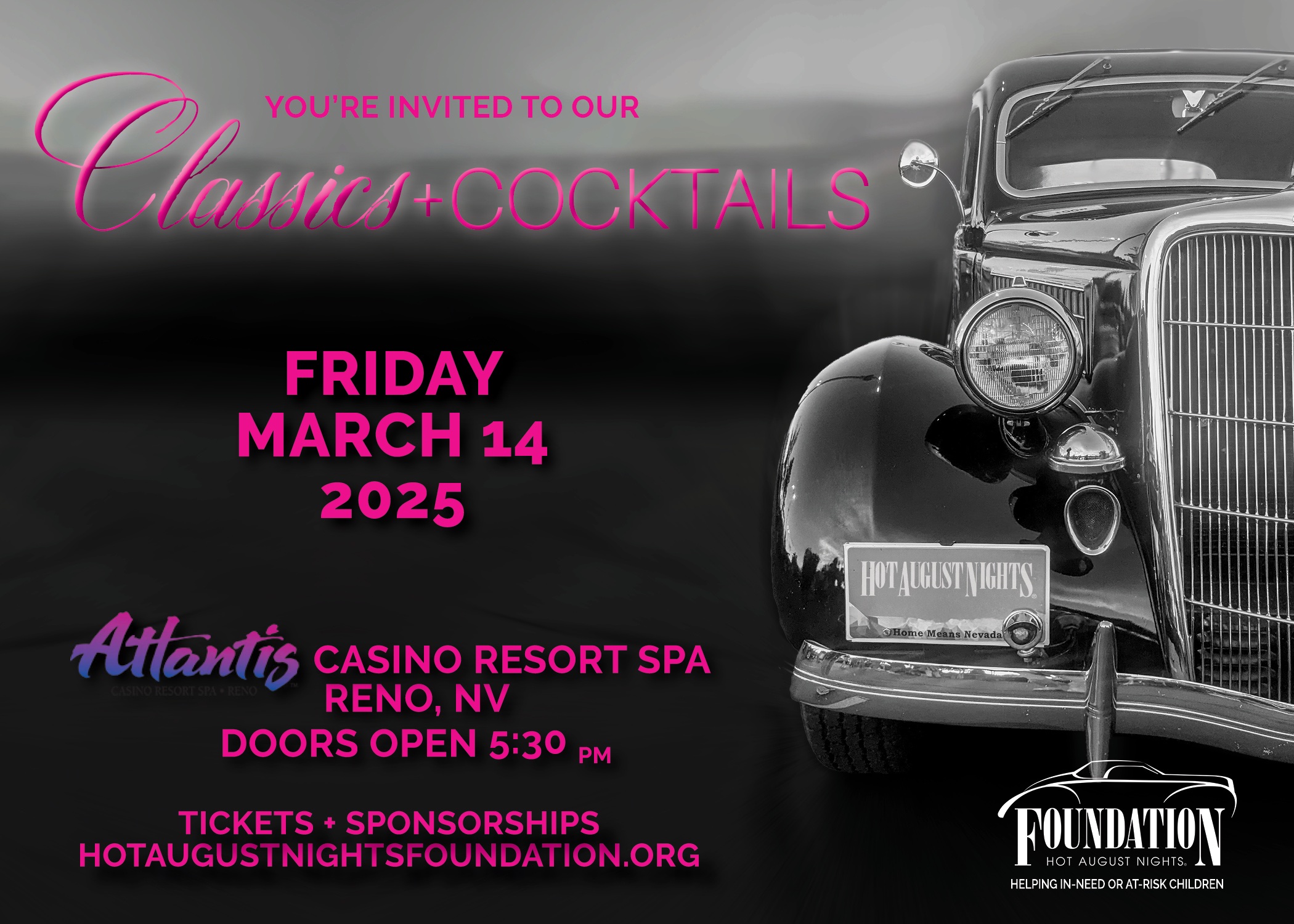 Hot August Nights Foundation invites you to our premier annual fundraiser, Classics & Cocktails! This prestigious event brings our community together to celebrate our achievements and raise crucial funds for kids who are at risk or in need. Join nearly 500 esteemed guests for an elegant evening featuring dinner, an exciting auction, and inspiring stories of the lives being changed through your generosity.
